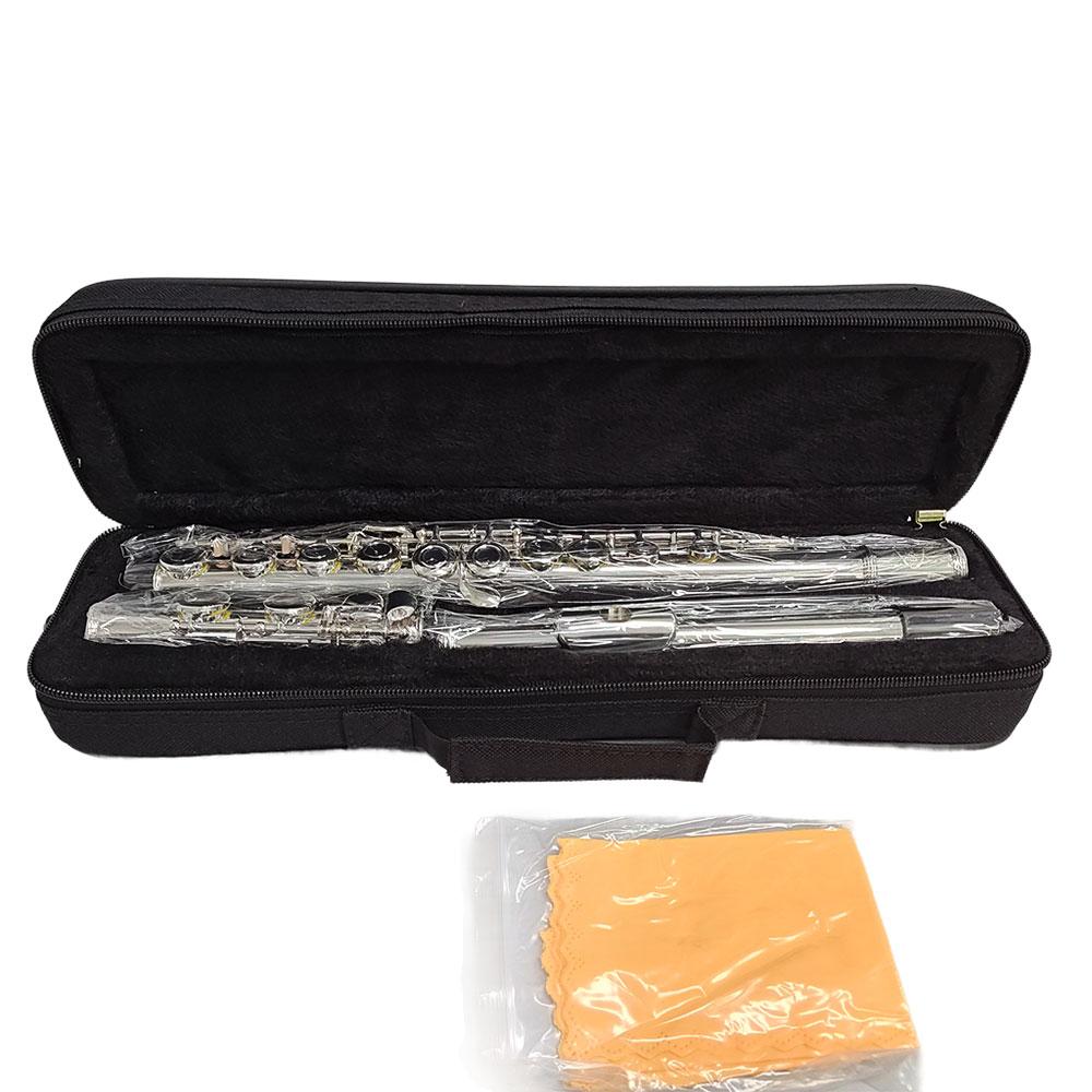 Flauto in Do, fori chiusi, Mi snodato, testata argentata, custodia e accessori.