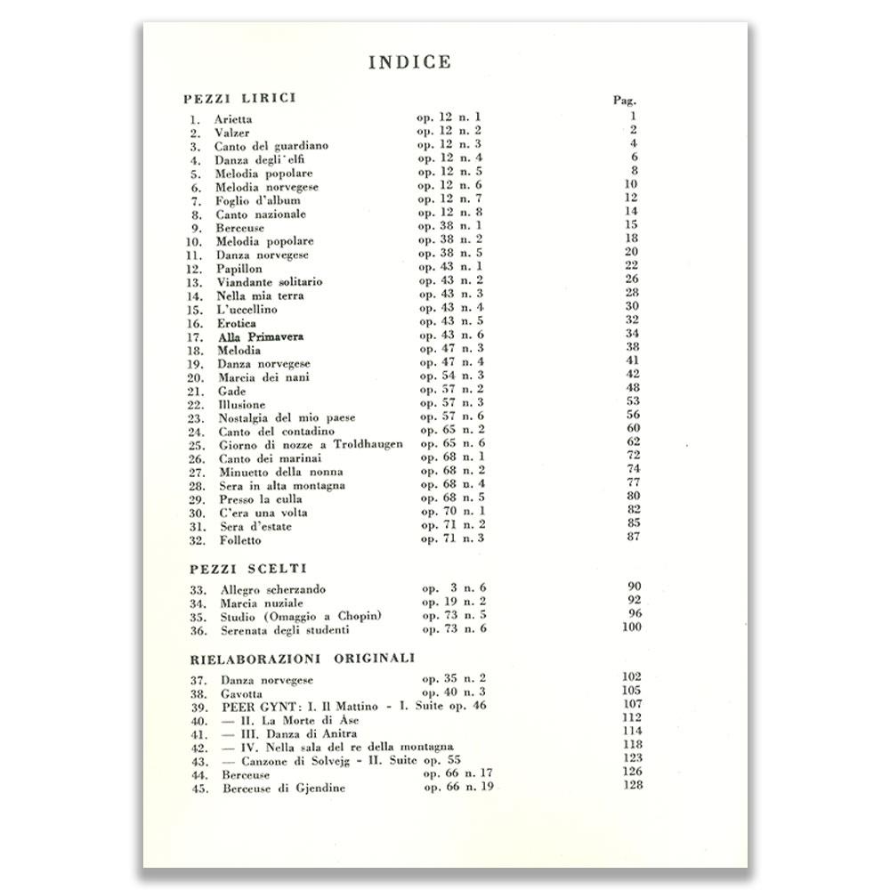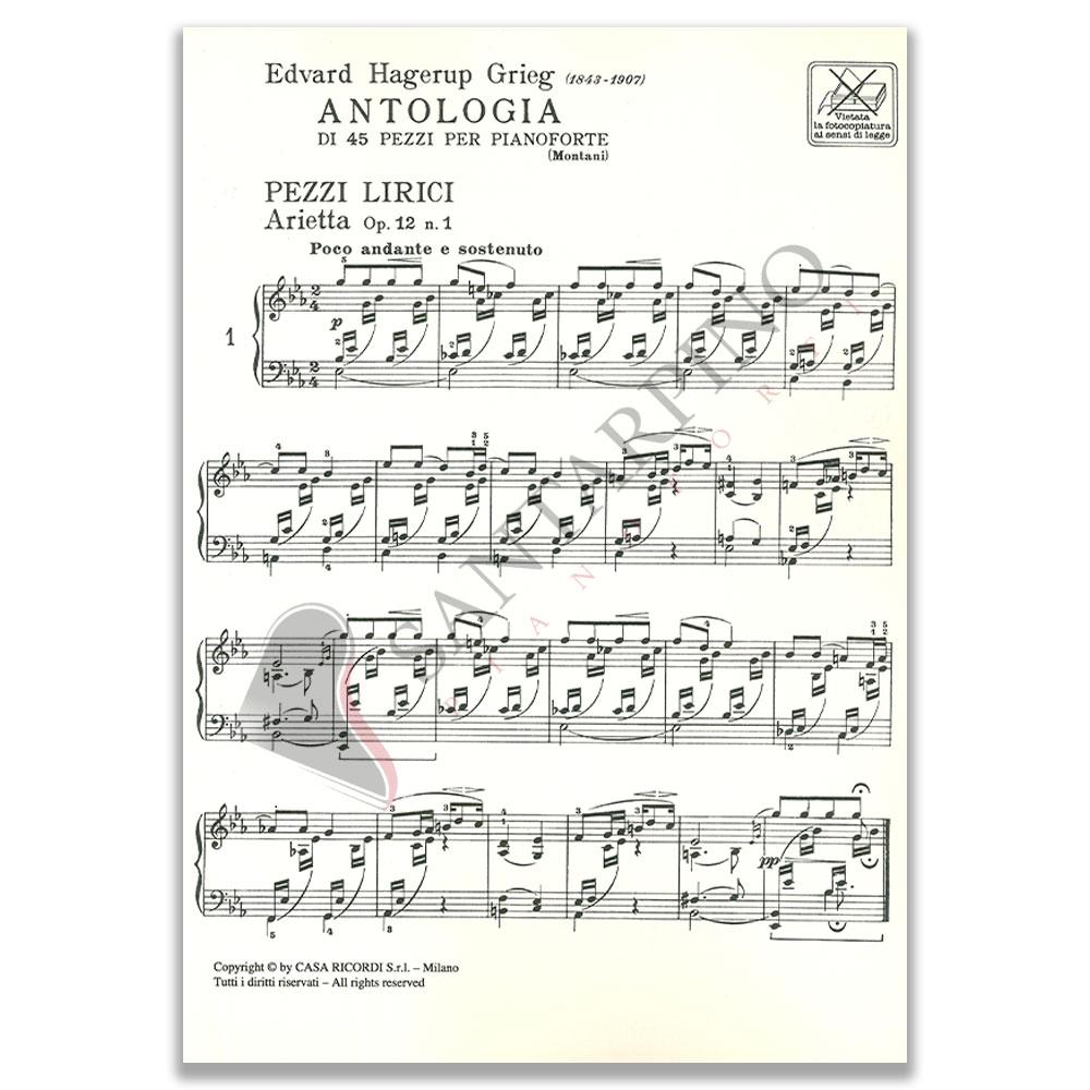 L'”Antologia di 45 Pezzi Grieg” pubblicata da Edizioni Ricordi è una raccolta completa e variegata delle composizioni più celebri del compositore norvegese Edvard Grieg. Attraverso questa edizione, i musicisti possono esplorare una vasta gamma di capolavori pianistici, orchestrali e da camera, offrendo un’ampia panoramica del genio musicale di Grieg e fornendo un prezioso repertorio per l’esecuzione e lo studio.
