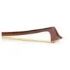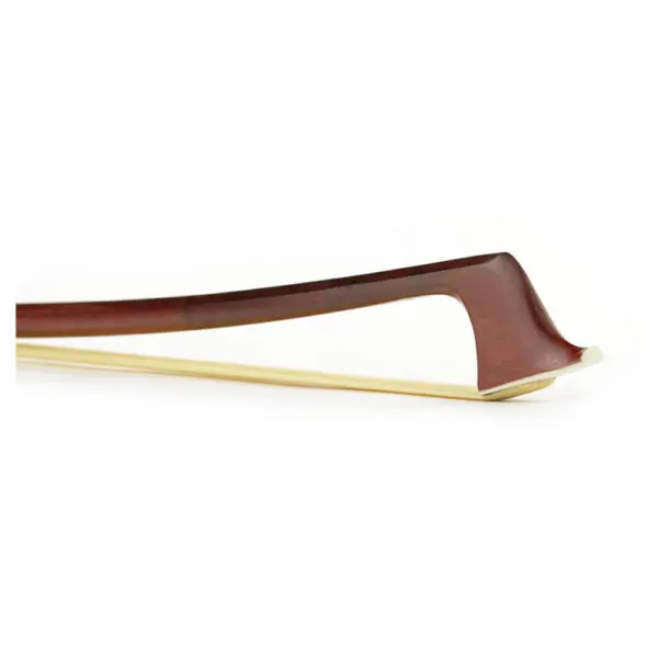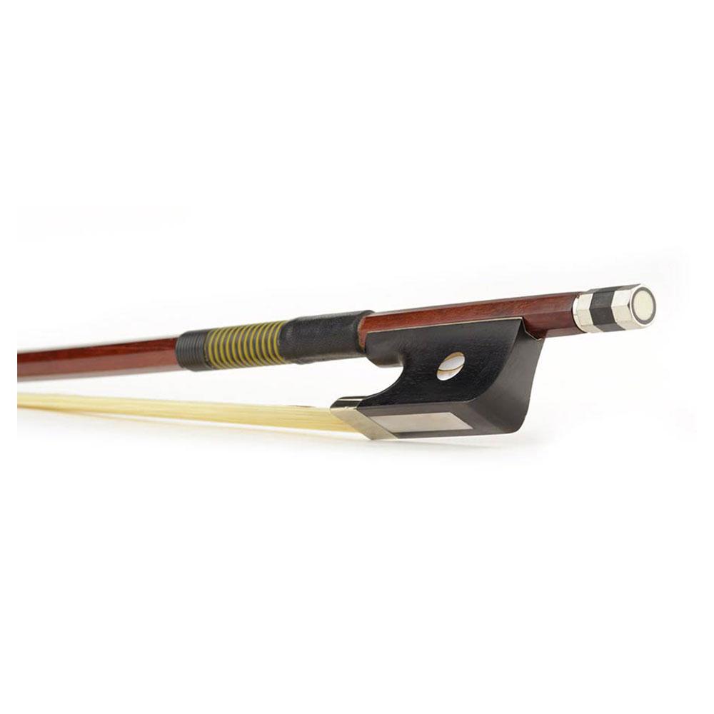 Arco da violoncello, misura 3/4, costruito in legno del Brasile. Bacchetta ottagonale, nasetto in ebano con occhio singolo. Scarpetta in osso di balena sintetico. Fasciatura in guscio di tartaruga sintetica.