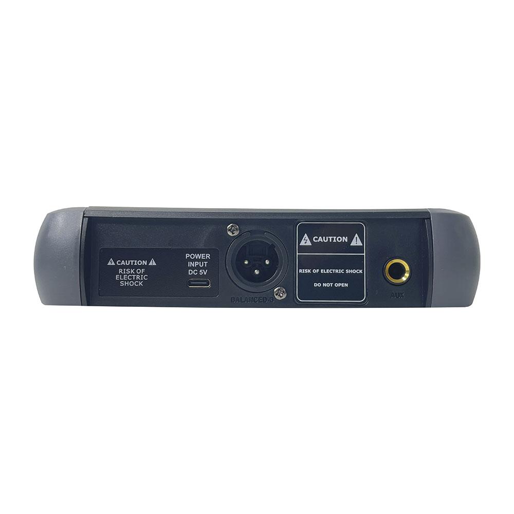 La base ricevente alimentata tramite porta USB rappresenta una soluzione estremamente flessibile: può essere collegata a diffusori amplificati, mixer, power bank, notebook o a qualsiasi dispositivo dotato di uscita USB. Un’esclusiva caratteristica del sistema è la possibilità di cambiare la frequenza operativa direttamente dal microfono, senza intervenire sulla base ricevente, con 16 canali disponibili.