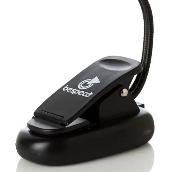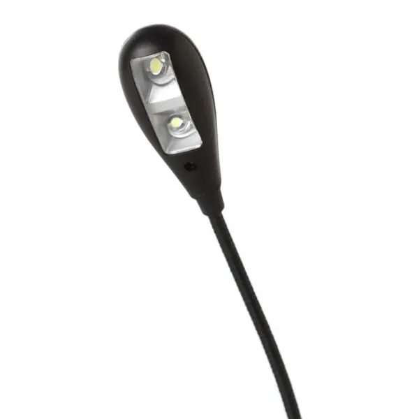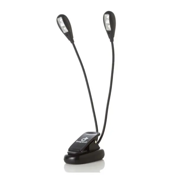 Lampada a LED per leggio con due bracci flessibili e 4 LED. Aggancio a pinza con protezione in gomma. Interruttori indipendenti per ogni braccio, doppio livello di illuminazione, possibilità di alimentazione a batterie (3xAAA incluse), tramite cavo con presa USB (incluso) o con alimentatore a 5Vcc (non incluso).
