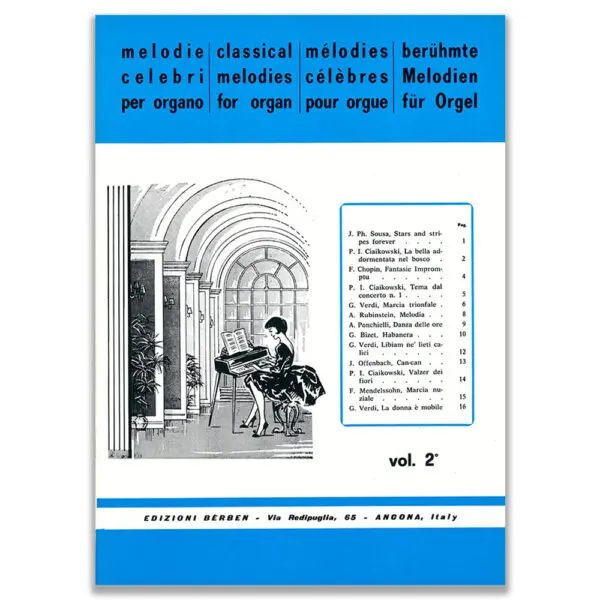 “Melodie Celebri per Organo Volume 2” delle Edizioni Berben è una collezione di brani selezionati per l’organo. Questo volume offre una varietà di melodie celebri adatte per l’interpretazione organistica, comprendendo pezzi di diversi stili e periodi musicali. Con una vasta gamma di composizioni, questo libro è una risorsa preziosa per gli organisti desiderosi di arricchire il loro repertorio con brani famosi.
