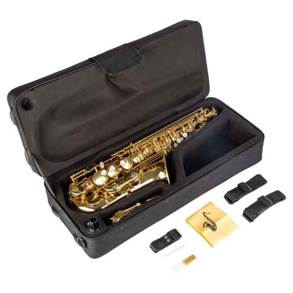 Sassofono Contralto in Mib School, finitura laccata, tamponi in pelle con risuonatori metallici. Custodia in foam. Accessori: bocchino con legatura e copribocchino, grasso, tracolla, panno pulizia.