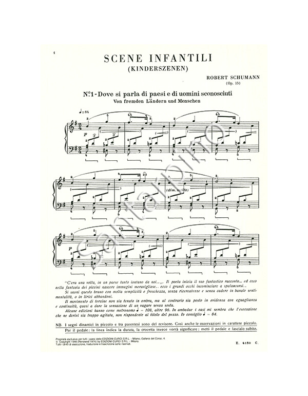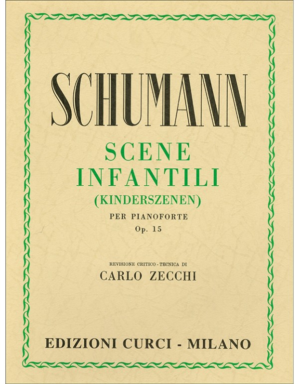 “Scene infantili op. 15” di Robert Schumann, pubblicato da Edizioni Curci, è una delle opere più celebri del compositore tedesco e rappresenta un gioiello del repertorio pianistico romantico. Composta nel 1838, questa raccolta di 13 brevi pezzi per pianoforte evoca il mondo dell’infanzia attraverso la sensibilità e l’immaginazione tipiche di Schumann. L’edizione Curci è particolarmente apprezzata per la cura editoriale e le annotazioni utili per interpretazioni sia didattiche che professionali.