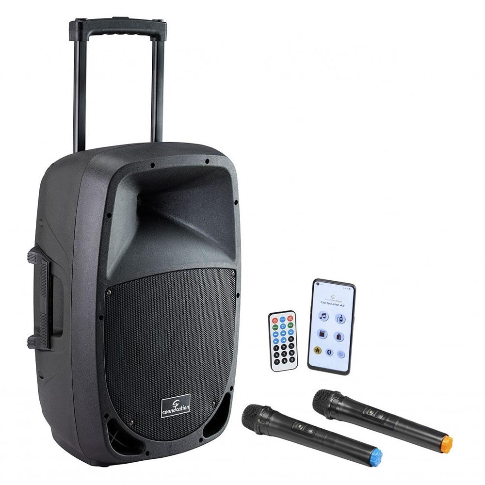 SISTEMA PA PORTATILE DA 15″ 800 WATT CON APP GO-SOUND AIR, 2 RADIOMICROFONI VHF, TROLLEY E BATTERIA