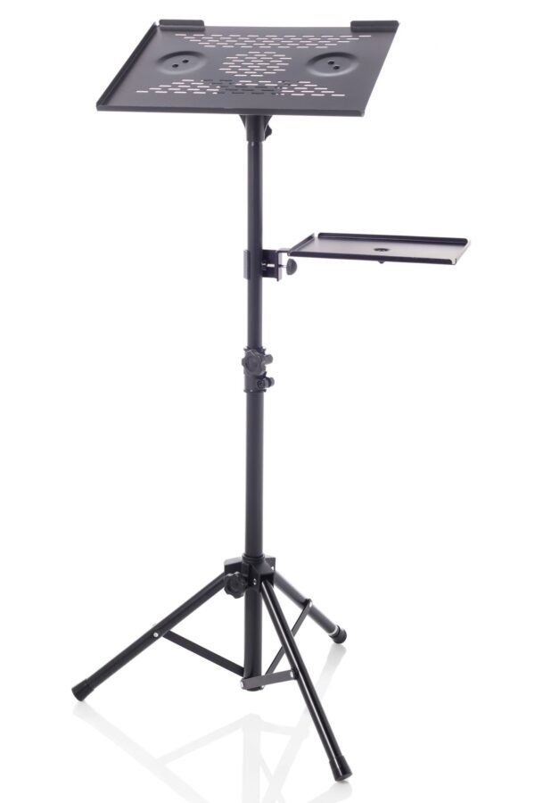 Supporto per laptop o videoproiettore realizzato in acciaio e regolabile in altezza ed inclinazione. Ripiano forato per la ventilazione delle apparecchiature e bordi rialzati per un alloggio sicuro. Corredato di ripiano laterale per mouse o altro