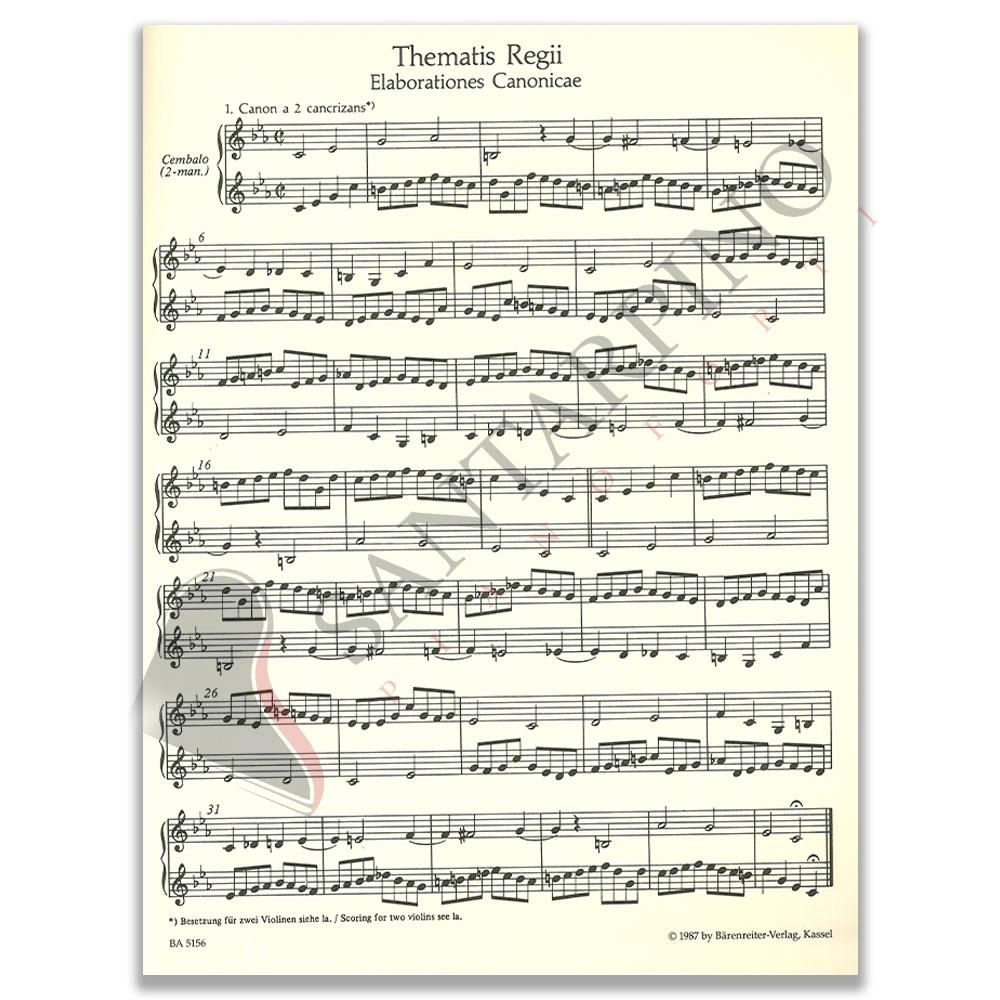 The Musical Offering (Das Musikalische Opfer) BWV 1079 è una raccolta di canoni e fughe e altri brani di J.S. Bach, tutte basate su un unico tema musicale donatogli da Federico II di Prussia, a cui sono dedicate. La strumentazione è ancora oggetto di dibattito, alcuni studiosi affermano che, a parte la sonata in trio, il resto dei brani sono pensati per tastiera sola. In questo volume presentiamo i Canoni per Flauto, due Violini, Clavicembalo Obbligato e Basso Continuo.
