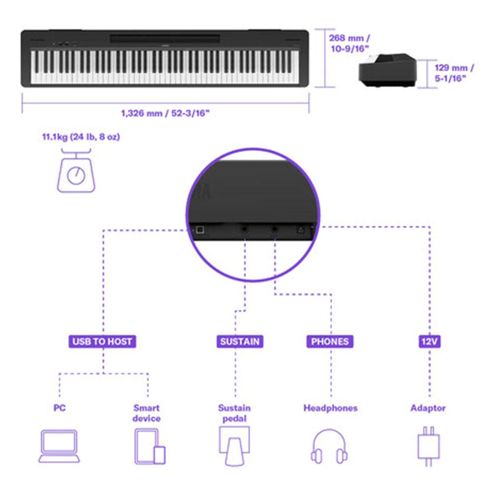 Il P-143 fornisce una brillante soluzione a questi problemi. Con il suo design elegante, il più compatto della serie P, questo modello si adatta perfettamente all’arredamento di qualsiasi stanza. Con la custodia morbida opzionale, puoi portare il P-143 con te in studio, a concerti dal vivo o in viaggio, ogni volta che ne hai bisogno.